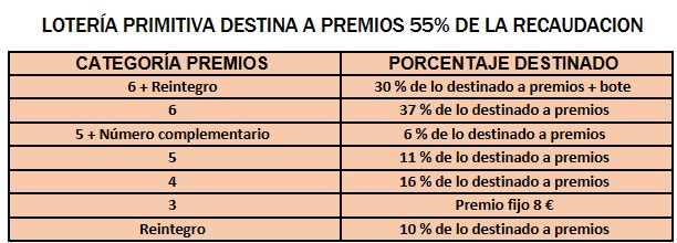 El jackpot inicial en ambas loterías es de 2 millones de euros. Al ser la lotería española mucho más difícil de ganar son más frecuentes las acumulaciones de los botes. En la lotería Primitiva no existe ninguna limitación ni por números de sorteos sin acertantes ni por importe del premio. El premio record de esta loto se reparte en Octubre de 2.015, un único acertante gana un premio de 101,7 millones de euros. Las normas del sorteo destinan a premios el 55% del importe recaudado. El porcentaje de la recaudacion destinado a categoría de premios es el siguiente: